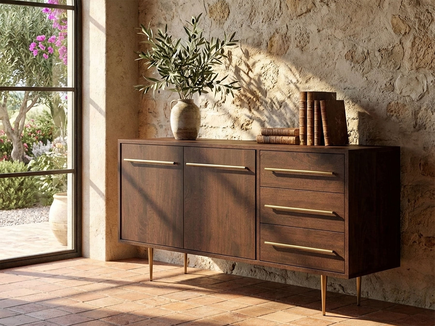Sideboard, solid mango wood and steel, 2 doors and 3 drawers